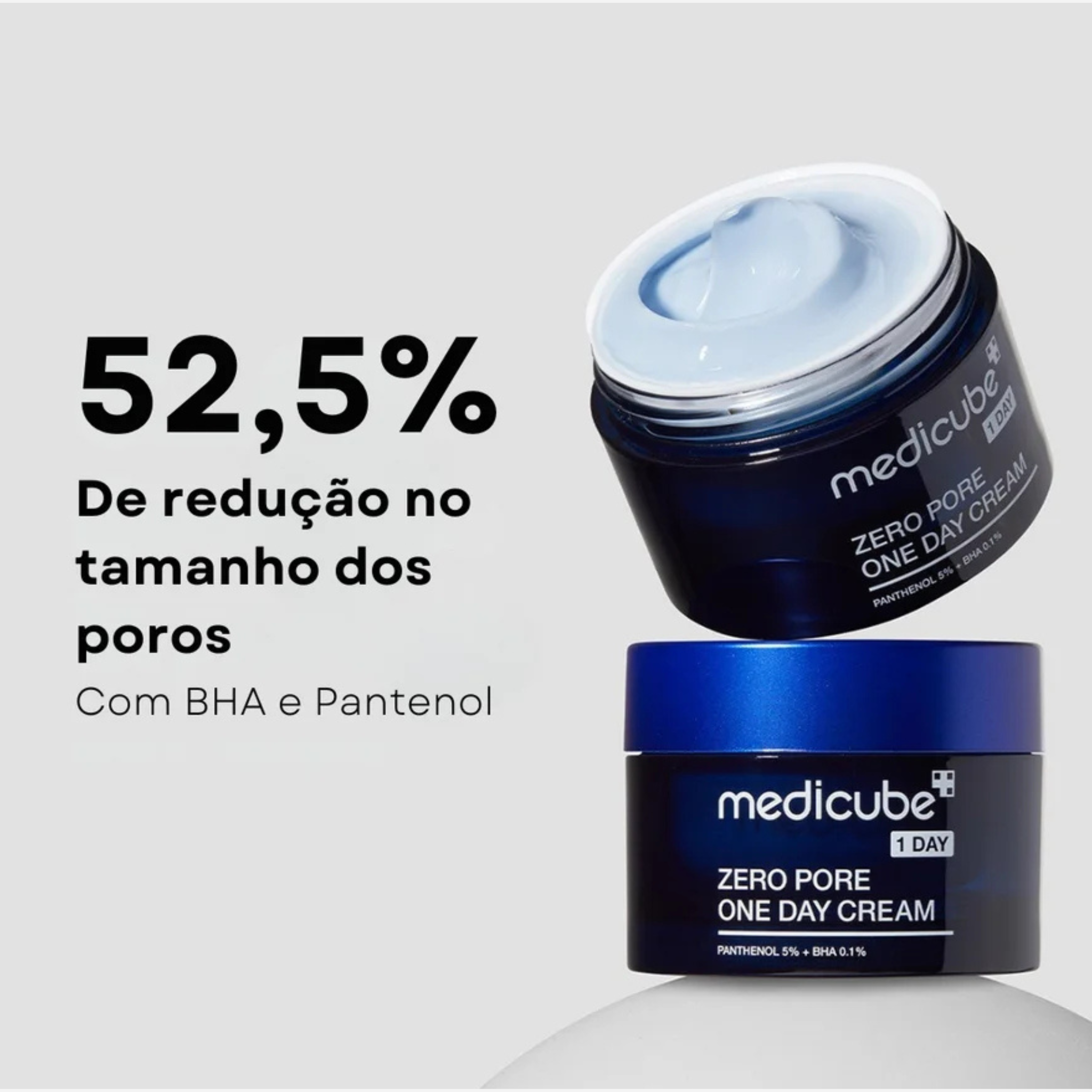 O Creme Zero Poro 1-day da Medicube é um creme multifuncional que atua no refinamento dos poros, controle da oleosidade e hidratação profunda, com efeito visível desde a primeira aplicação.